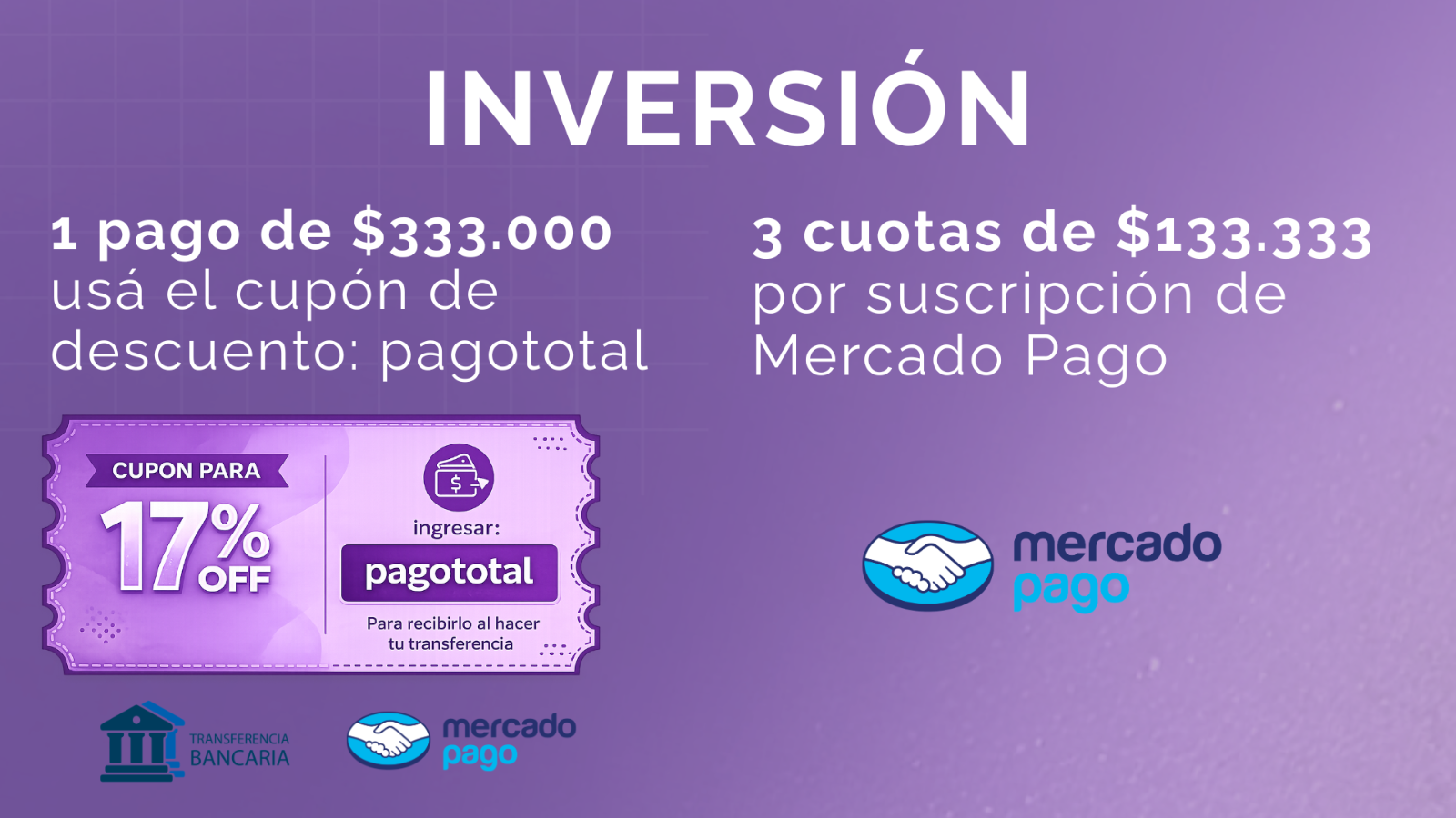 Podés pagar por transferencia bancaria o mercado pago en 1 pago accediendo a un descuento y abonás $333.000. O en 3 cuotas mensuales de $133.333 cada una, por mercado pago suscripción.